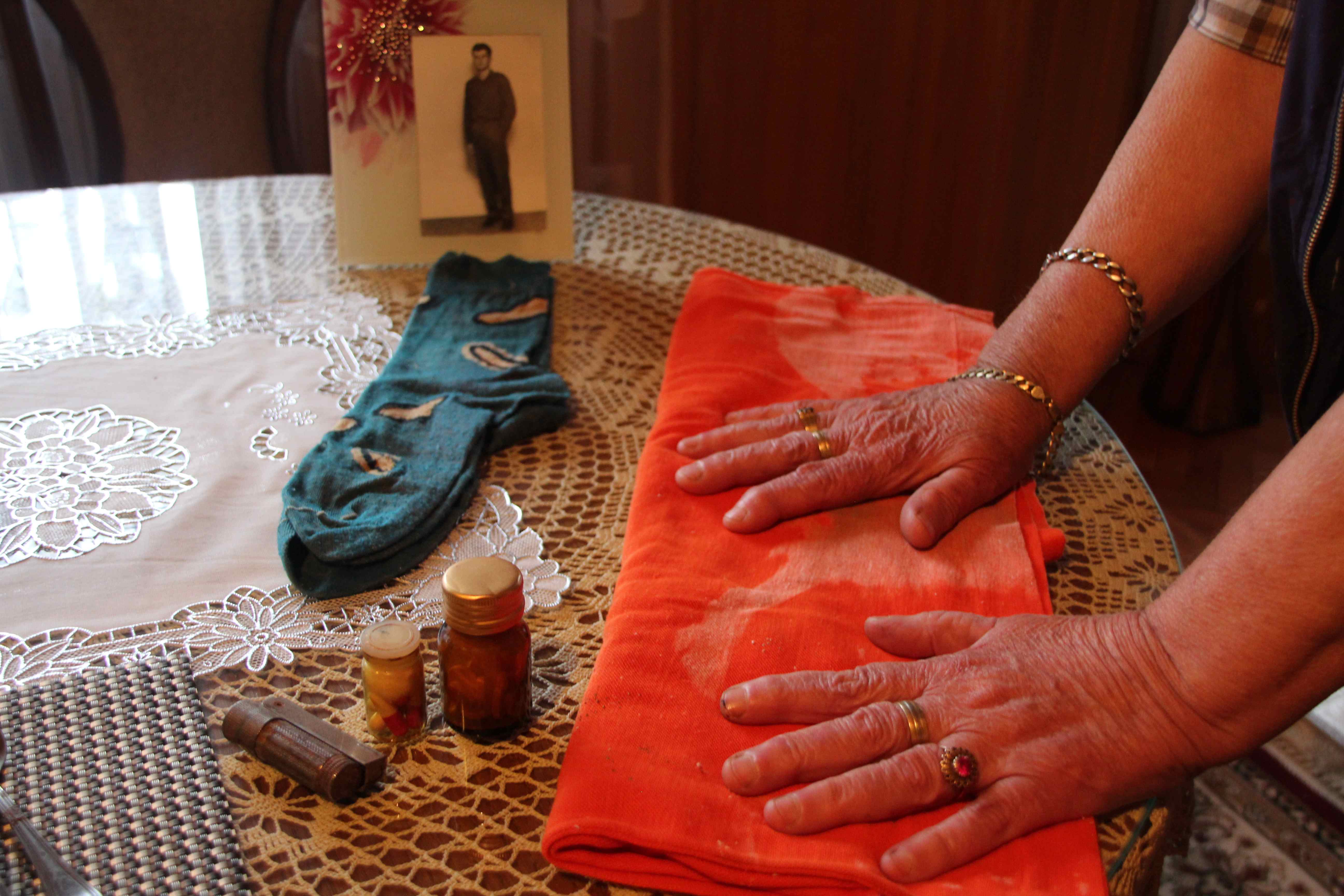 I robicu njegovu sam oprala i donila. Čarape nisu istruhle, košulja nije, ja sam to oprala i donila. I njegova lična karta i njegov upaljač i njegovi ljekovi i njegove naočale, ja sam to sve oprala i donila. Ima stalno onaj njegov miris. Ja znam da je Hasanu to nekad smetalo,  al džabe, ja to uzmem u ruke tamo u sobi i gledam. I kaiš njegov donesem, košulju, te čarape i naočale, novčanik, ličnu kartu i tako to što nije istruhlo. Obuće nisam našla. Mora da su mu skinuli. Drago moje sunce… Ovo je krv bila pa pobijelila. Drago moje srce… Evo… Ja sam to prala i tako to…